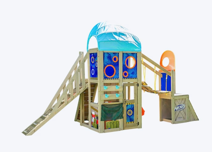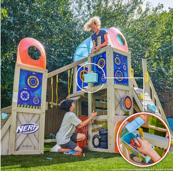 Combine a playset with Nerf features and you get the KidKraft Nerf command base battle fort—the ultimate site for epic blaster battles. Storm across bridges, ladders and gangplanks to gain the best vantage point. Exit quickly through the escape trap door. Stockpile blasters and darts in the battle prep area or pulley crate. Plan missions and practice your aim to become a battle expert. Test your skills with a spinning target. Be in control of the backyard with this action-packed multi tower. Nerf blasters and darts not included.